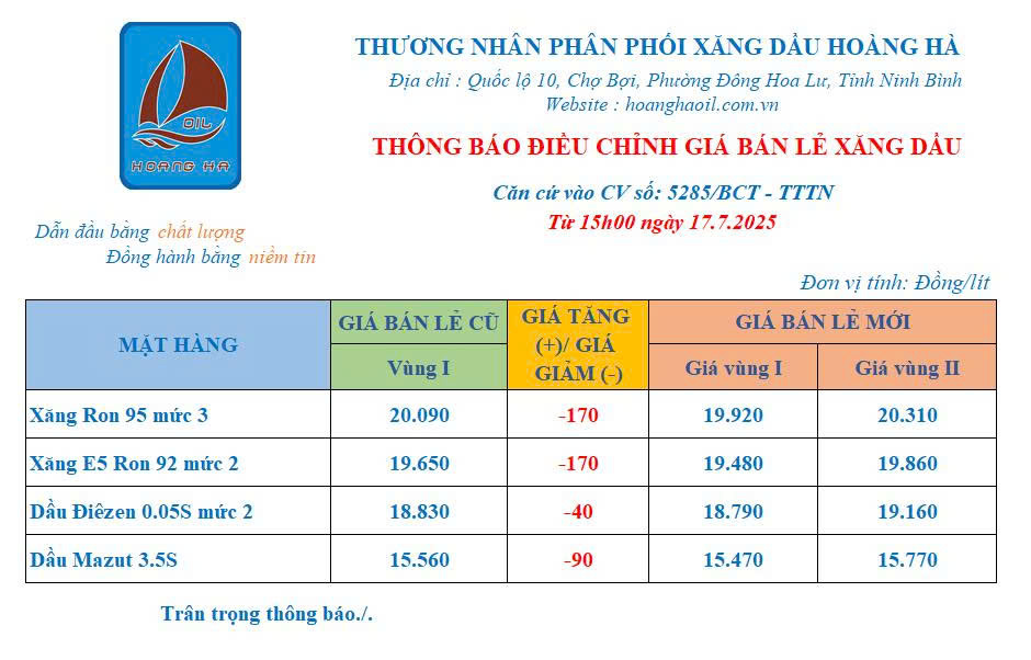 Trang chủ / ĐIỀU CHỈNH GIÁ BÁN LẺ XĂNG DẦU 17-07-2025