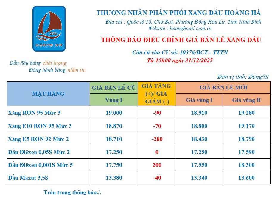 ĐIỀU CHỈNH GIÁ BÁN LẺ XĂNG DẦU 31 – 12 – 2025