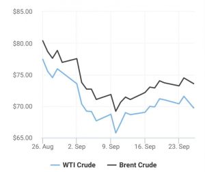 Trong sáng nay 26/9, giá xăng dầu thế giới giảm khi lo ngại về tình trạng gián đoạn nguồn cung ở Libya giảm bớt, các kế hoạch thúc đẩy kinh tế mới nhất của Trung Quốc không thể làm giảm được lo ngại về nhu cầu.