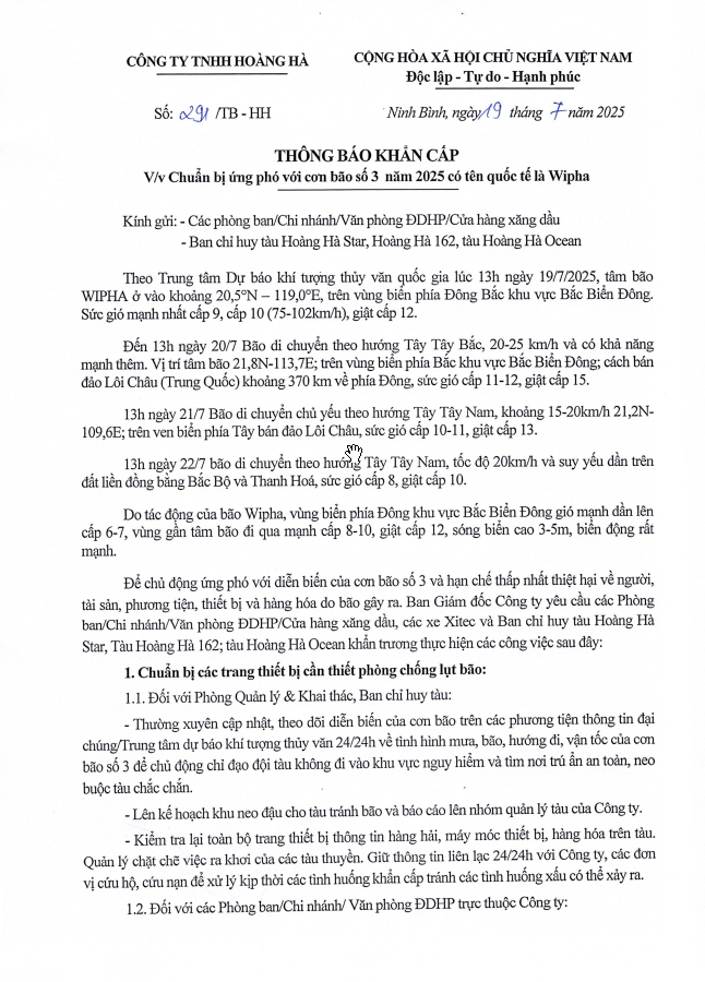 Trang chủ / Thông báo khẩn cấp số 291/TB-HH V/v Chuẩn bị ứng phó với cơn bão số 3 năm 2025 có tên quốc tế là Wipha