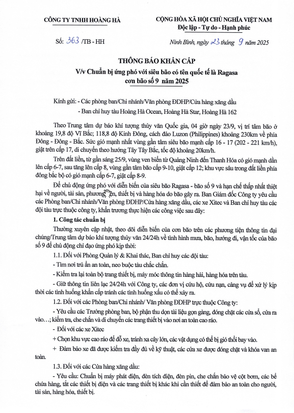 Trang chủ / Thông báo khẩn cấp số 363/TB-HH V/v Chuẩn bị ứng phó với siêu bão có tên Quốc tế là Ragasa – cơn bão số 9 năm 2025 3 năm 2025 có tên quốc tế là Wipha