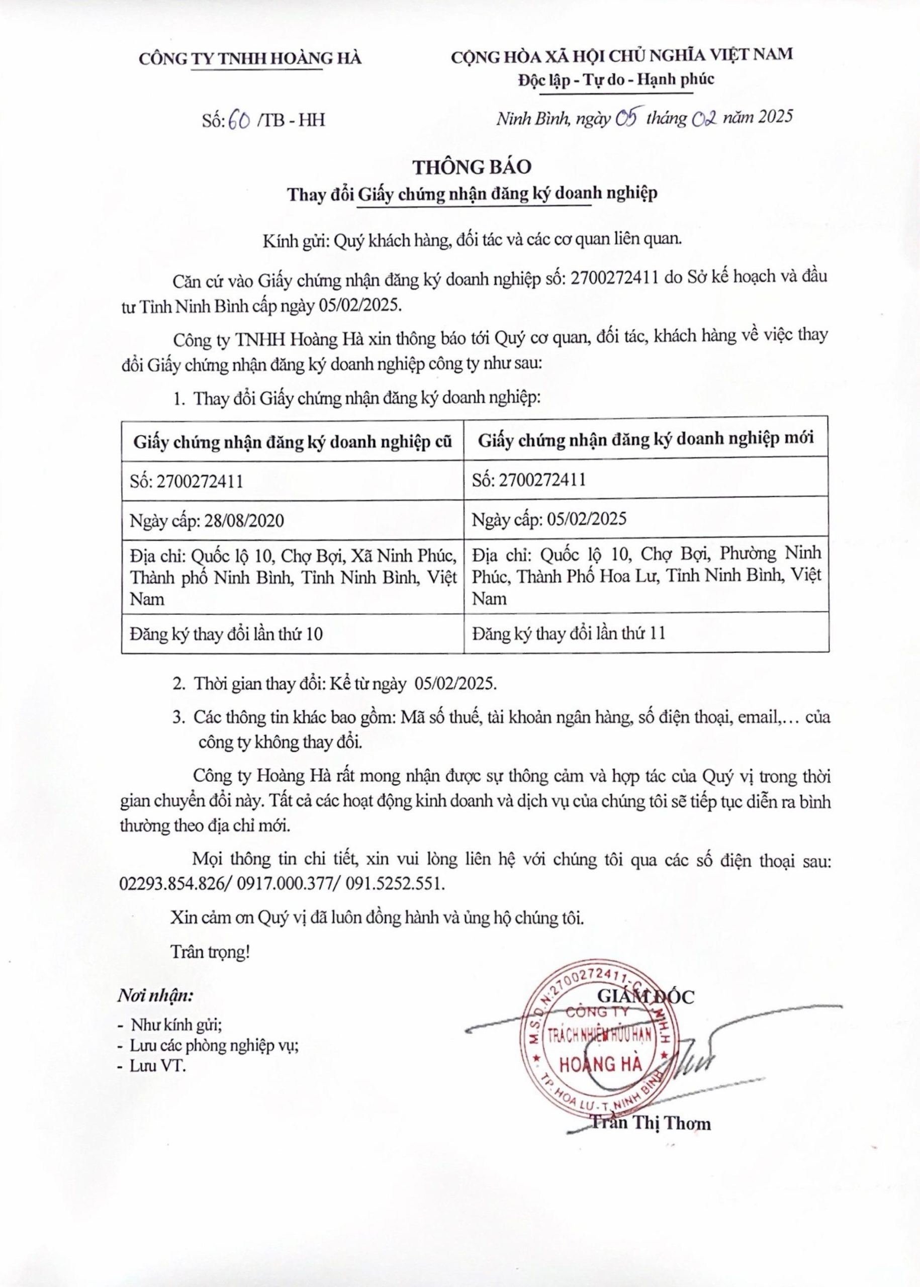 THÔNG BÁO Thay đổi Giấy chứng nhận đăng ký doanh nghiệp Công ty TNHH Hoàng Hà